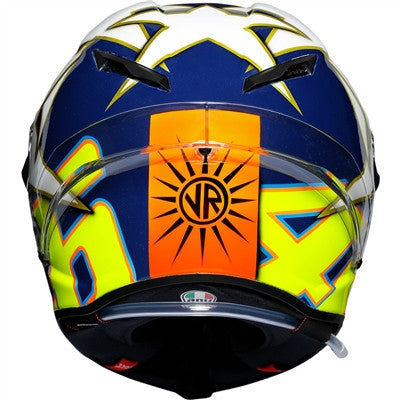This livery is the replica of the one worn at the end of the Sepang Grand Prix in 2003, to celebrate the fifth world title win - the third consecutive victory in the premier class of motorcycle road racing. The graphics that feature on the helmet are dominated by a sizable number 1, which appears on the front of the shell. This livery is unique, as Rossi has always favored the number 46, his historic race number. Despite his nine world titles, Valentino has never raced with number 1 on the fairing of his bike, and has always relegated it to a more minor “detail” on his racing suits. The sides and top of the helmet bear five stars, representing the Championships won by Rossi. Meanwhile, the classic sun image appears on the back of the shell, this time in a “tribal” design against an orange background.