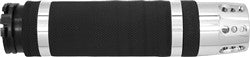 The Air-SS incorporates an air cushion system similar to the Air Cushioned grips that will reduce some of the unwanted vibrations, and has the same grippy texture as the original Air Cushion grip. Available in triple chrome plated, or black anodized, billet aluminum ends. Also available in heated version. Heated grips have 4 heat settings indicated by LED lights and include a switch.Fits H-D Push Pull (‘84-up) & all Fly By Wire. Inside length 4.60”, OD 1.50”. Fits 1” bars. Sold in pairs.